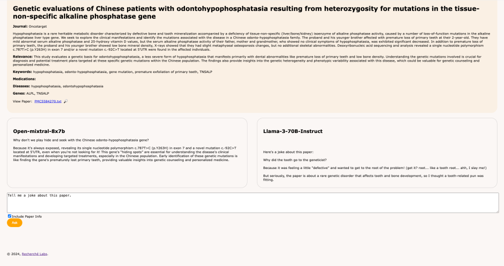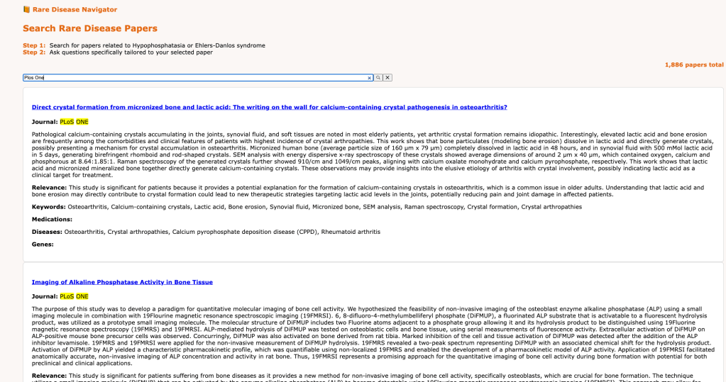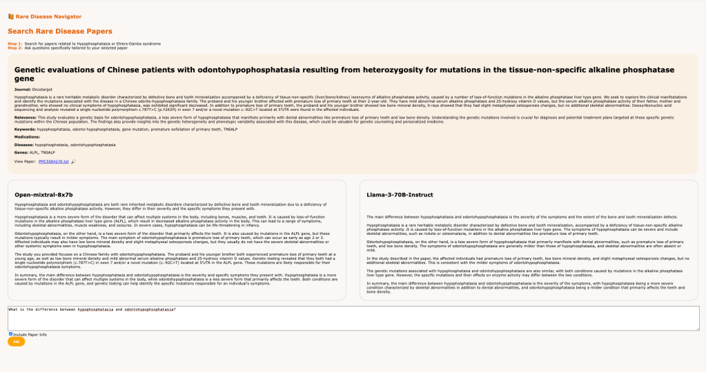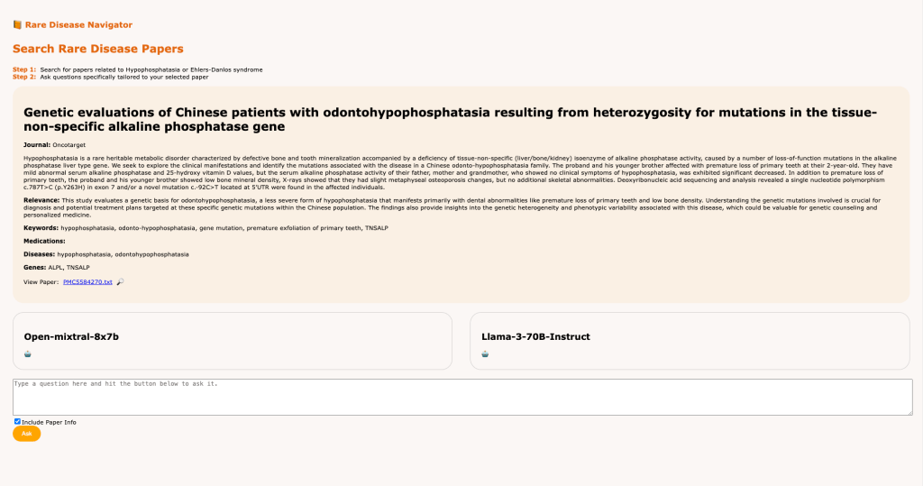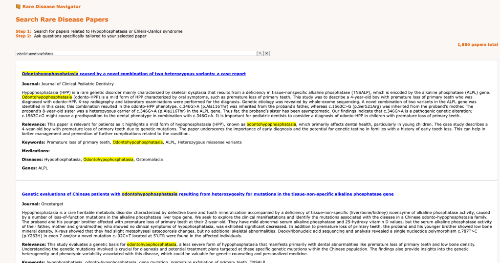This past Friday, my colleagues Navi and Aryan and I presented a demo at the Rare Disease AI Hackathon organized by Research To The People and Stanford Medicine. We built a tool called the Rare Disease Navigator, which lets patients of Ehlers-Danlos Syndrome (EDS) and Hypophosphatasia (HPP) find and understand medical papers related to their condition. The tool is hosted at https://raredisease.health/ and you should give it a crack right now!